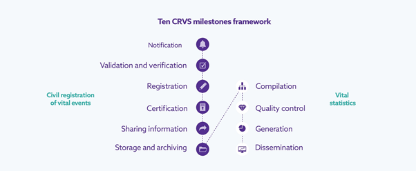 The 10 CRVS milestones framework is a useful diagram to understand the CRVS system as a whole.